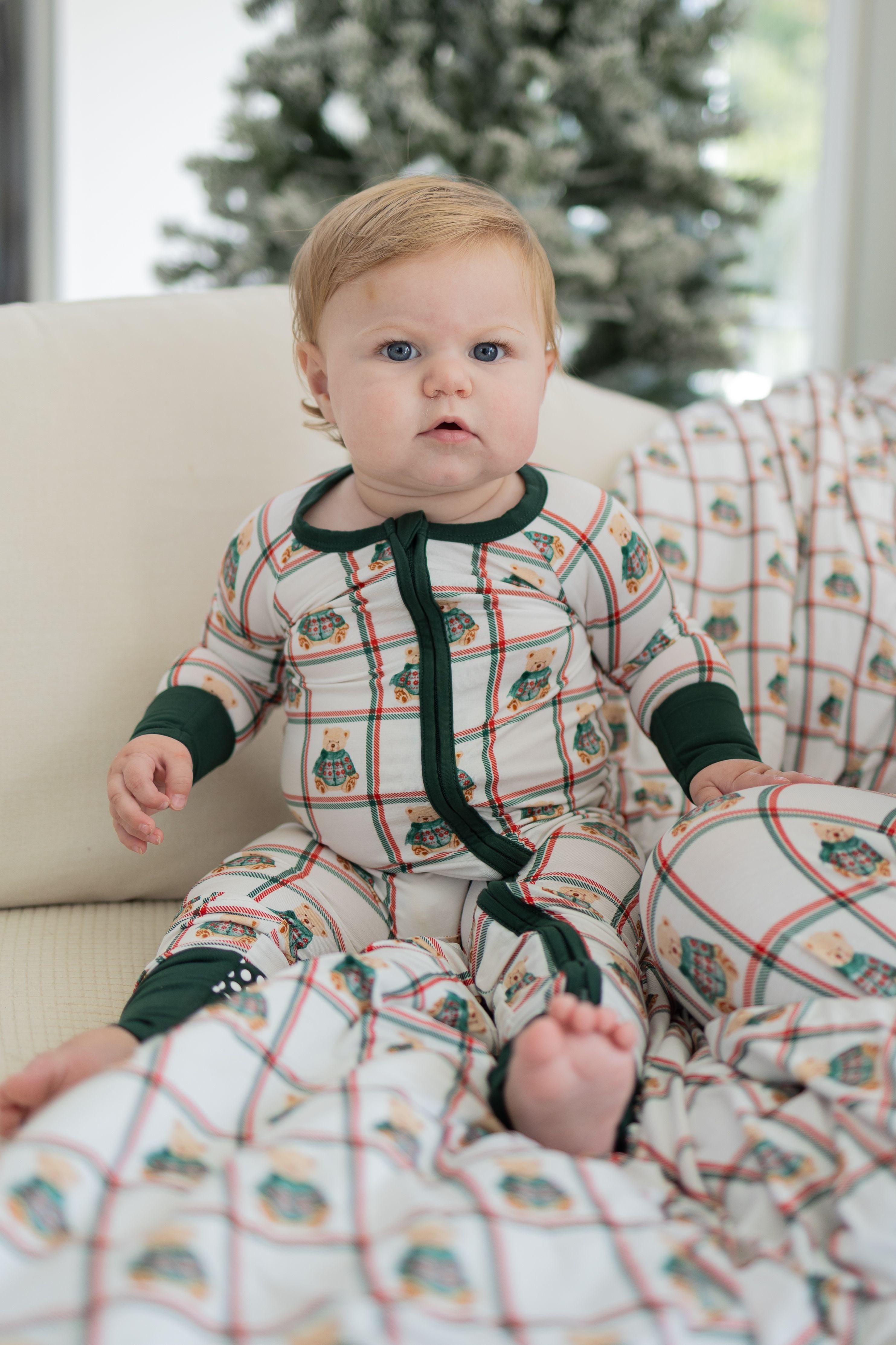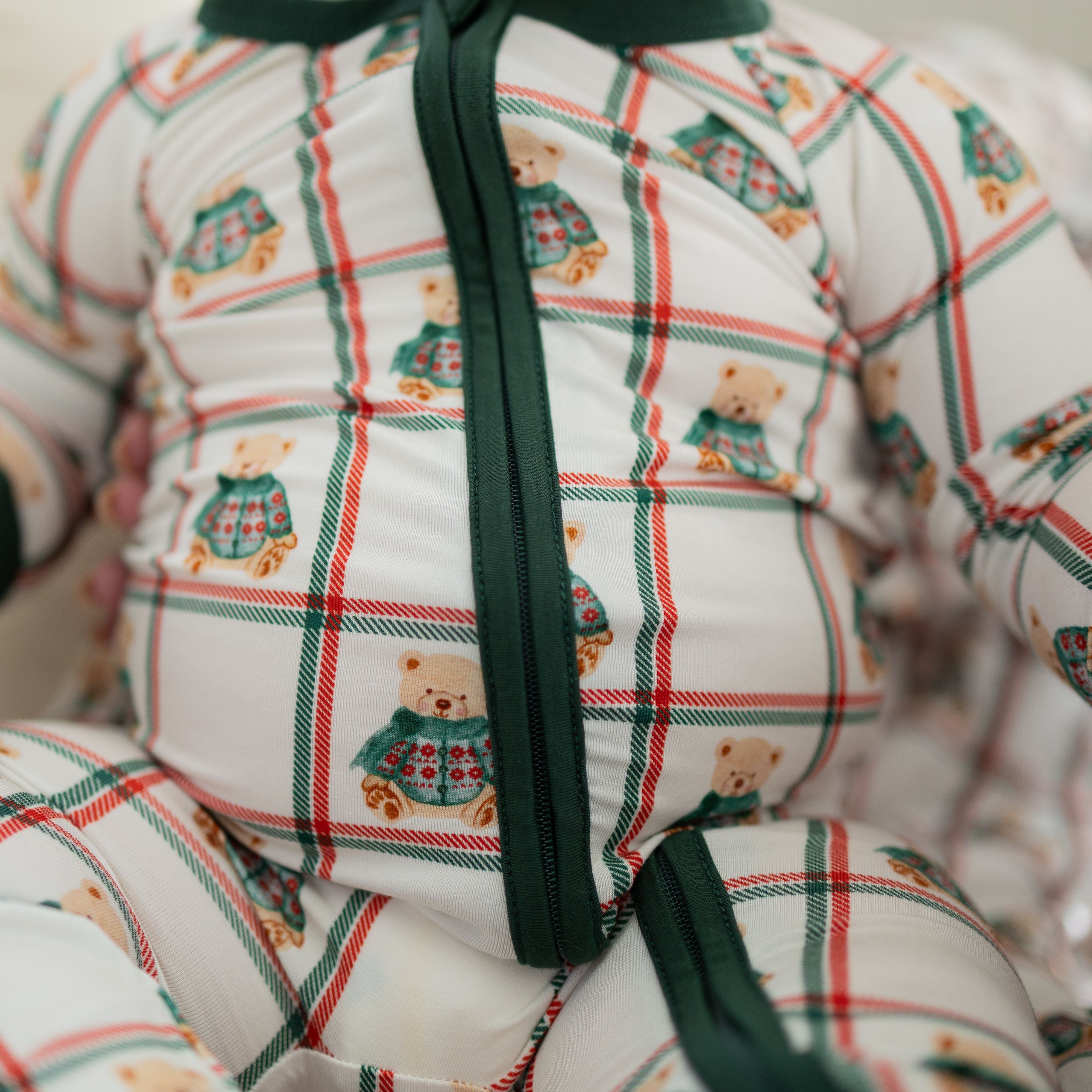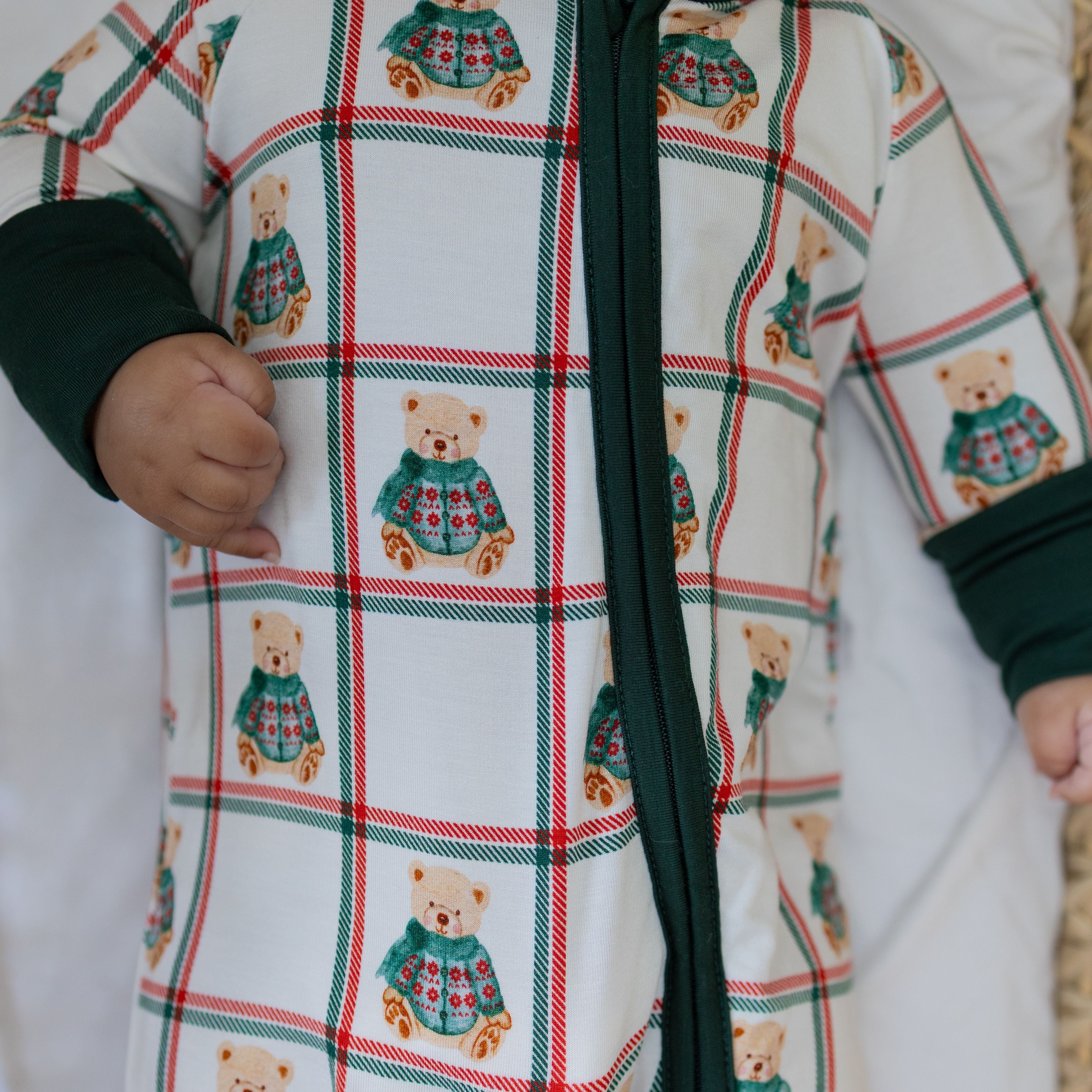 Bring on the nostalgia with our Vintage Teddy Christmas Romper—where classic holiday charm meets modern comfort. This timeless print features sweet teddy bears in festive green sweaters, nestled within a warm plaid backdrop. Made from buttery-soft, breathable bamboo fabric, it’s perfect for cozy winter mornings and bedtime snuggles. Designed with parent-loved details like fold-over feet and hands, plus a double-sided zipper for easy changes, this romper is as practical as it is adorable. A holiday must-have for your little one’s wardrobe!