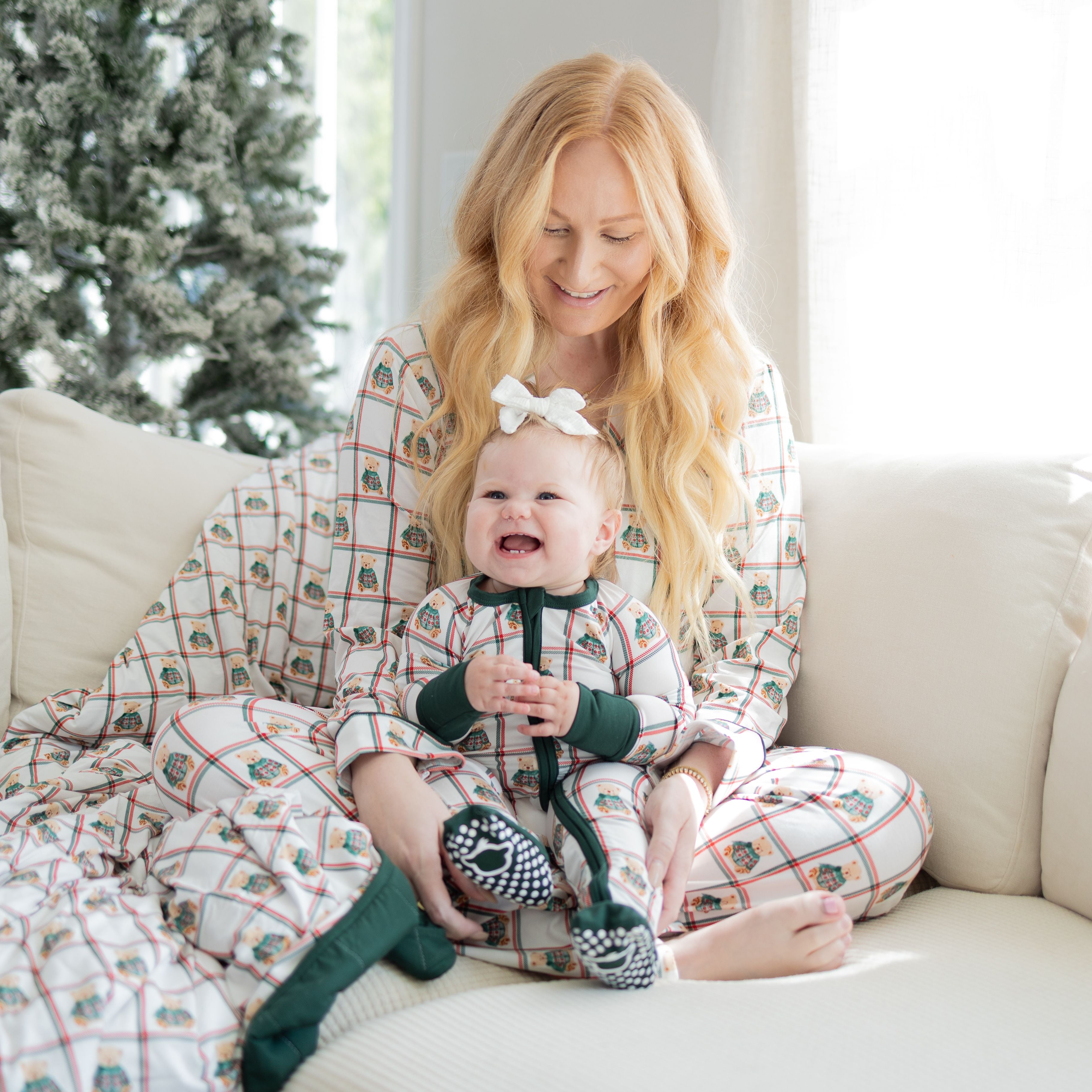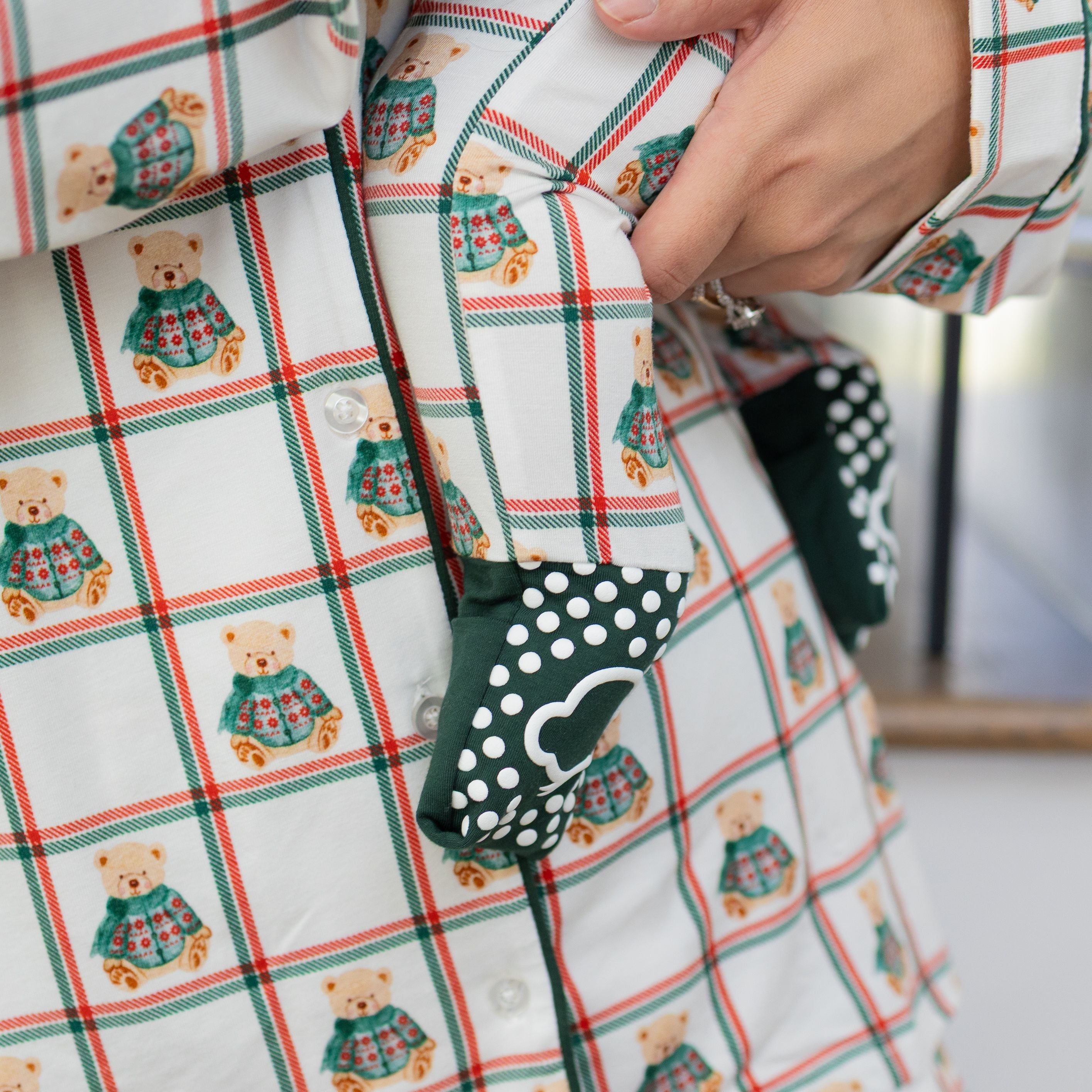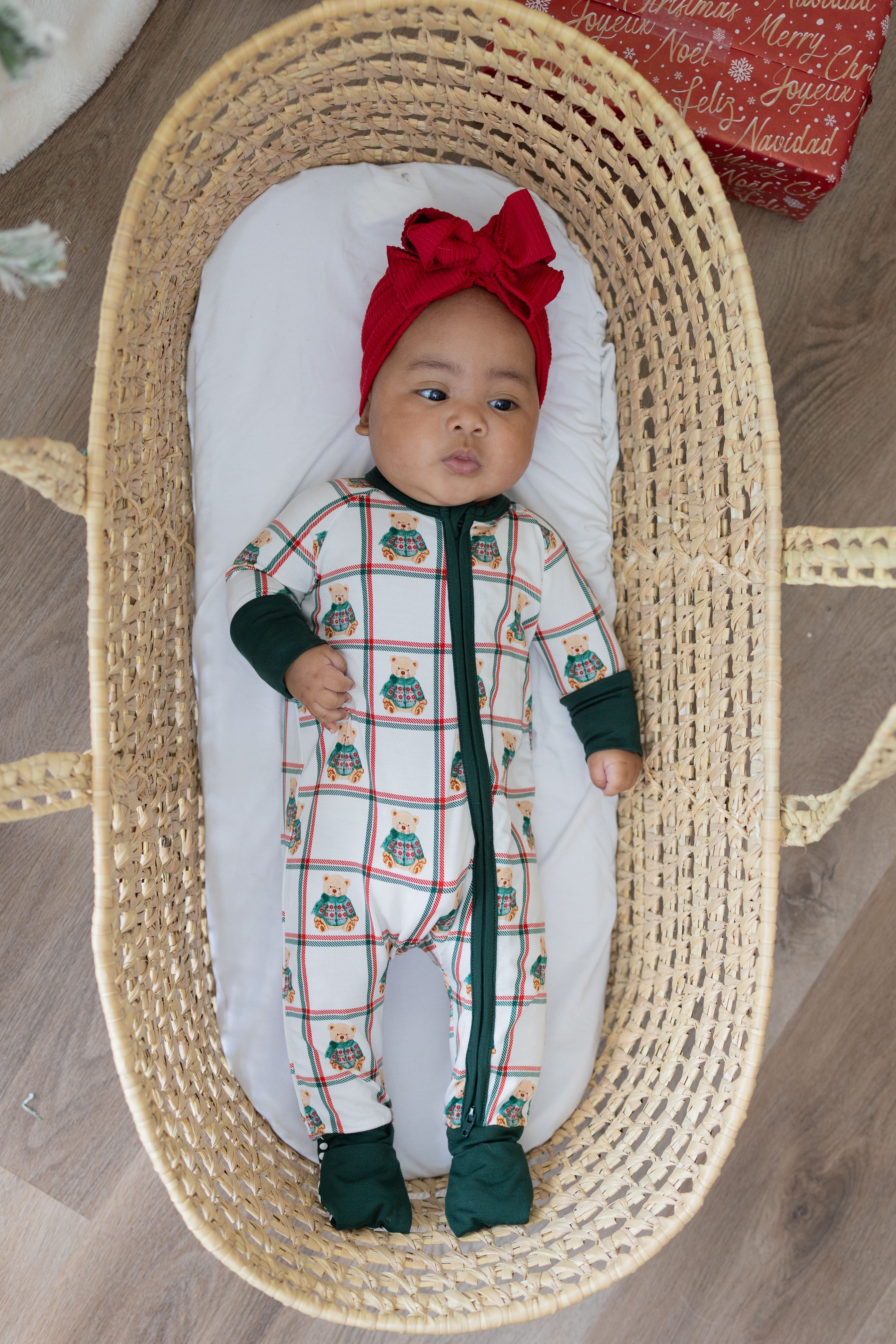 Bring on the nostalgia with our Vintage Teddy Christmas Romper—where classic holiday charm meets modern comfort. This timeless print features sweet teddy bears in festive green sweaters, nestled within a warm plaid backdrop. Made from buttery-soft, breathable bamboo fabric, it’s perfect for cozy winter mornings and bedtime snuggles. Designed with parent-loved details like fold-over feet and hands, plus a double-sided zipper for easy changes, this romper is as practical as it is adorable. A holiday must-have for your little one’s wardrobe!