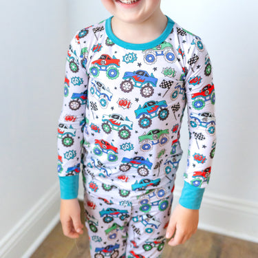 Get ready for a wild ride! Made with bamboo lyocell for ultimate comfort, this set features playful monster truck designs that will have your little one revving with excitement. Perfect for bedtime or playtime. Let the adventure begin!