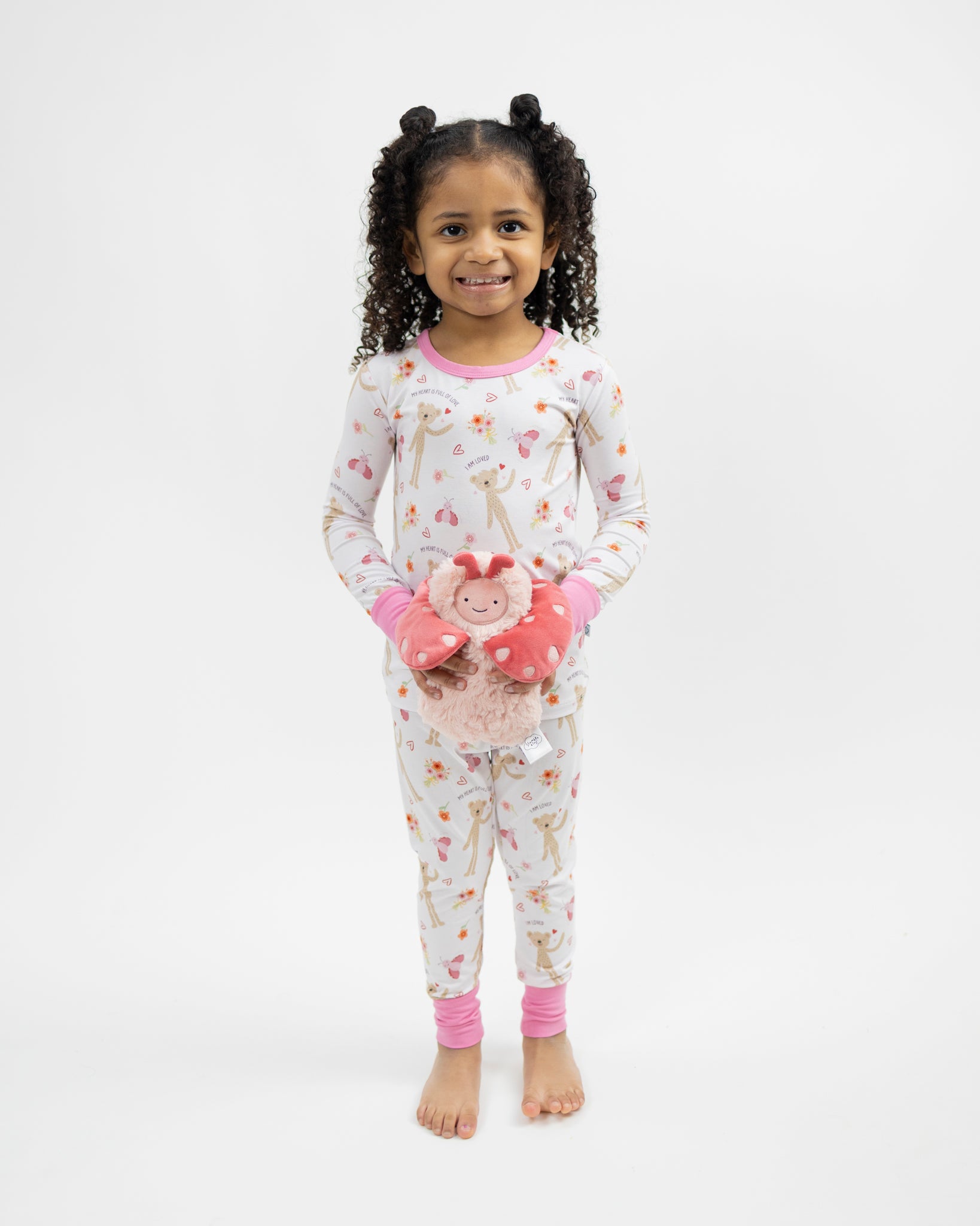 Our Slumberkins x Monkeeroos Bamboo Long Set featuring Honey Bear and Love Bug is made for cozy nights and meaningful moments. Crafted from ultra-soft, breathable bamboo lyocell, this two-piece set is gentle on sensitive skin and designed to move with growing toddlers. Perfect for bedtime routines, story time, and snuggles that last a little longer.