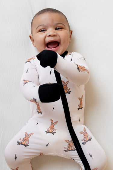 Adorable meets unbelievable softness in our Rad Rabbits Bamboo Pajamas! Featuring a cream background with playful brown rabbits on skateboards, this fun and adventurous print is designed for all-day comfort and all-night coziness. Made from our signature buttery soft 95% Bamboo Lyocell and 5% Spandex, it’s breathable, temperature-regulating, and tagless for the most gentle feel on sensitive skin. With incredible stretch that lasts up to 3x longer, this pajama set is as practical as it is cool—because little ones grow fast, but their favorite pajamas should last!