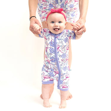 This soft and stylish short romper features a two way zipper for easy dressing (no more struggles!) and is made from bamboo, making it ultra comfortable. Made for a day out or peaceful slumber.