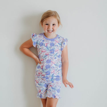 Featuring ruffled shorts and a printed top with flutter sleeves, this soft bamboo set is perfect for all-day wear. Experience ultimate comfort while looking effortlessly chic.