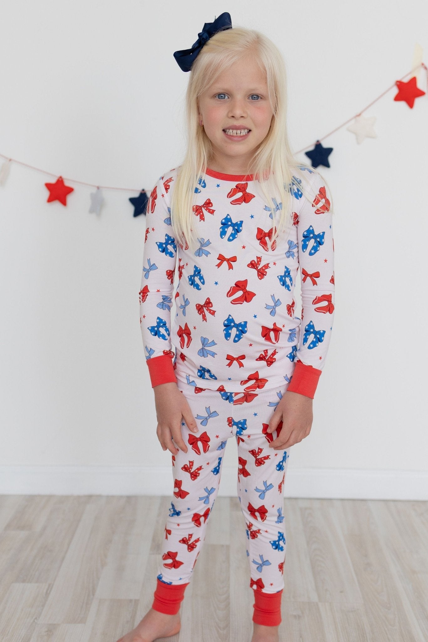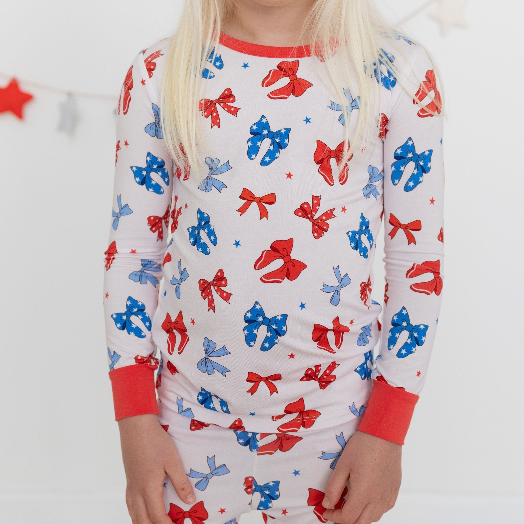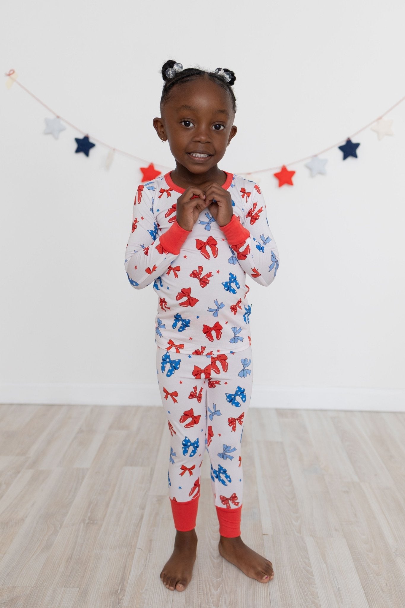 Made for star-spangled snuggles and everyday adventures, our Red, White & Bows Long Set brings patriotic charm and unmatched comfort to your little one’s wardrobe. Featuring our signature soft bamboo fabric and a playful print full of stars, stripes, and sweet bows, this cozy two-piece is perfect for holiday fun or year-round wear.