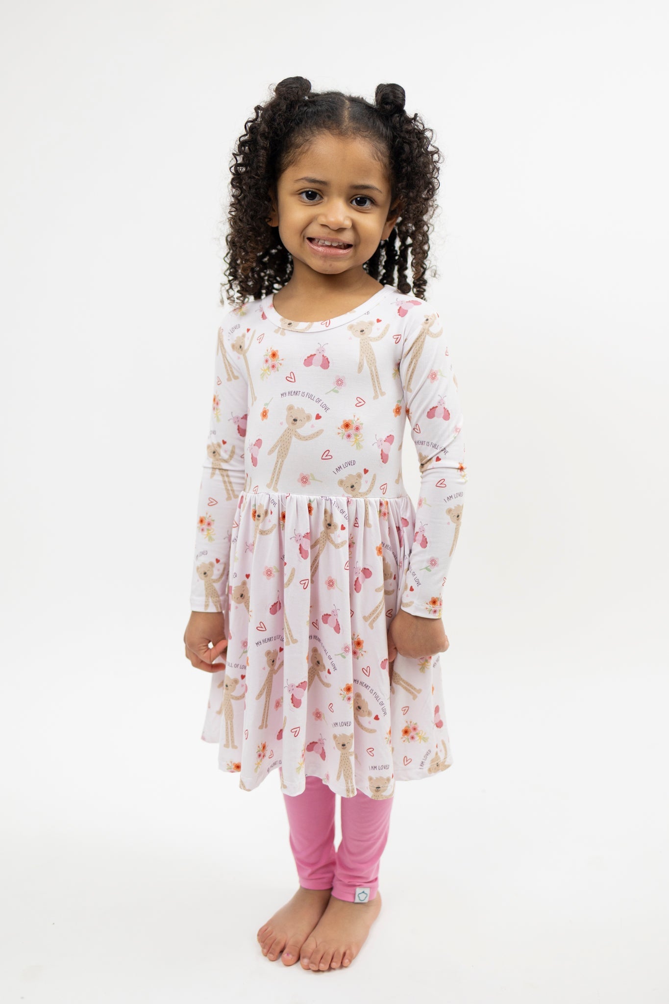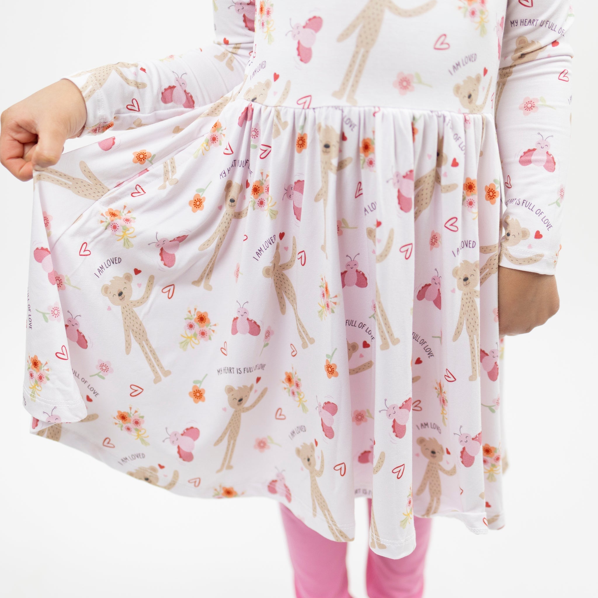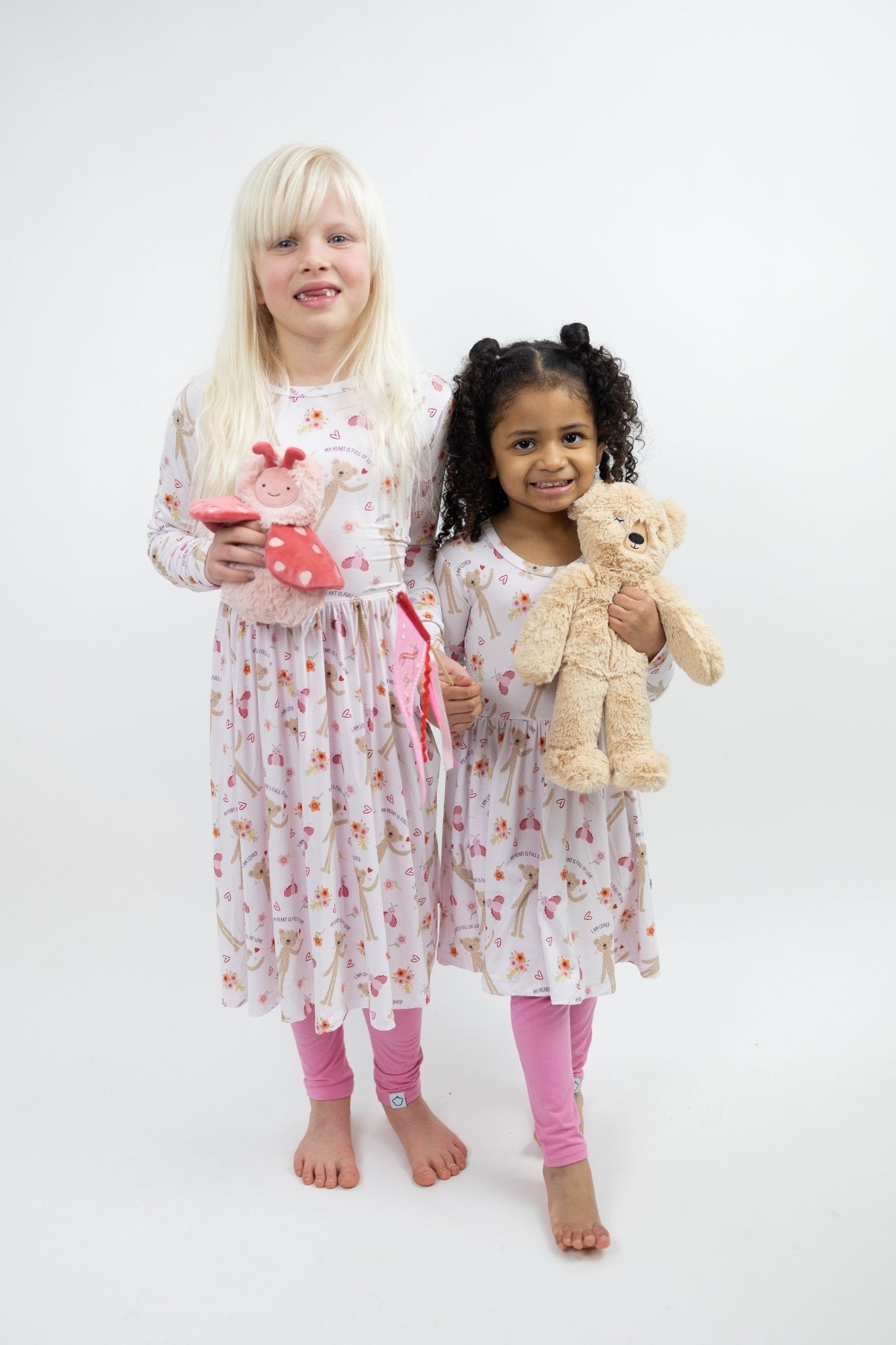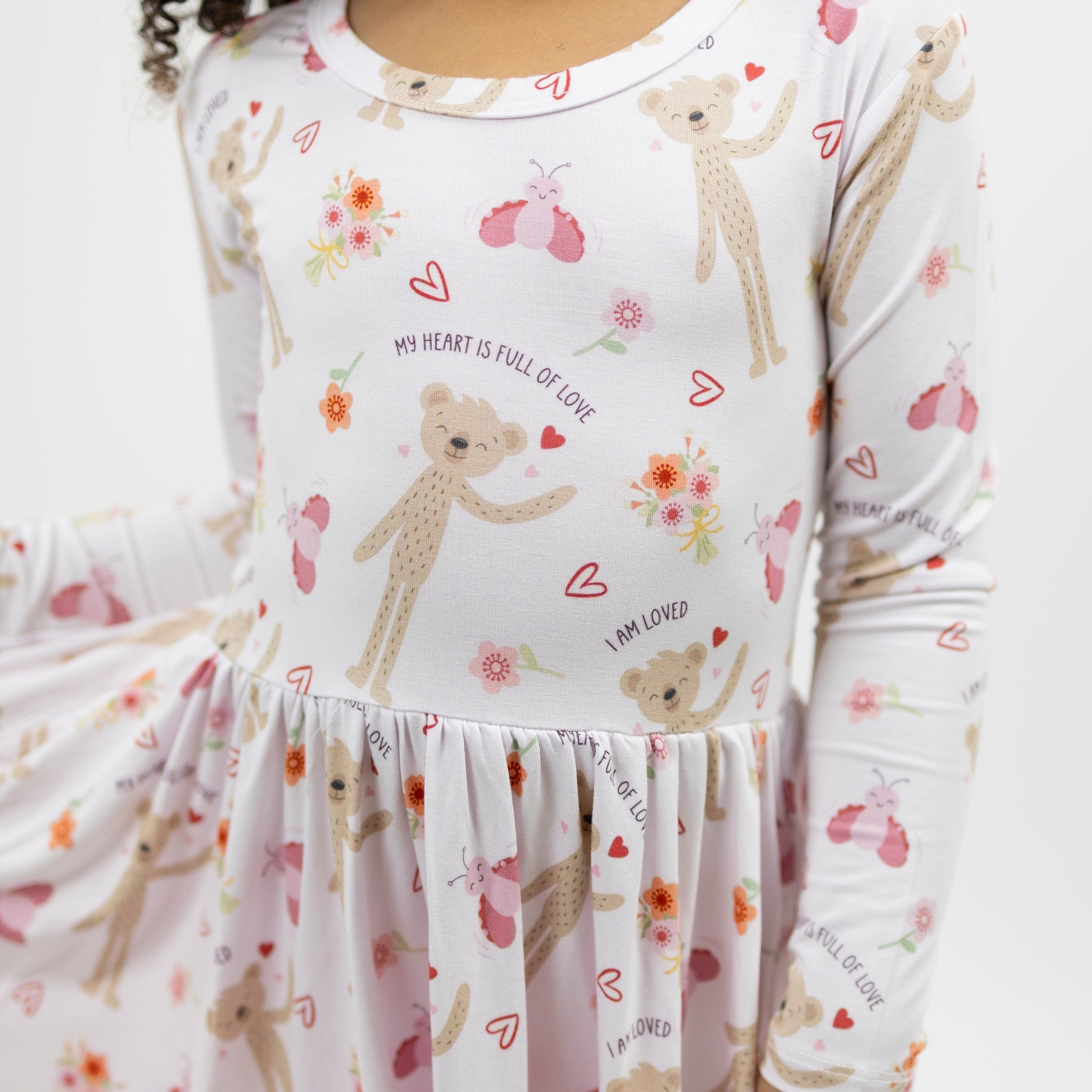 Our Slumberkins x Monkeeroos Twirl Dress featuring Honey Bear and Love Bug is made for magical moments and everyday play. Crafted from ultra-soft, breathable bamboo lyocell, it’s gentle on sensitive skin with a flowy twirl skirt little ones love. Perfect for playtime, parties, and cozy moments that make childhood extra special.