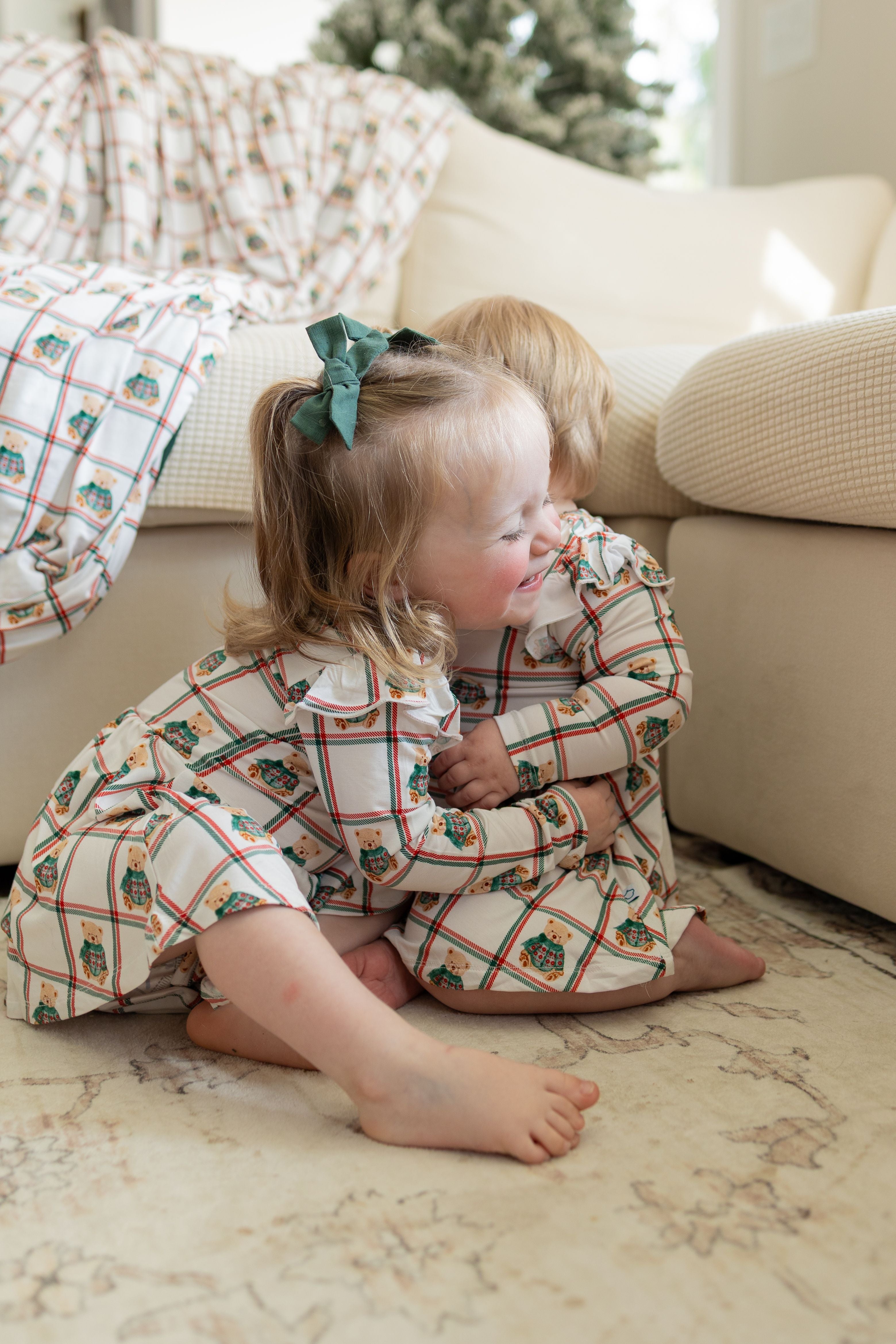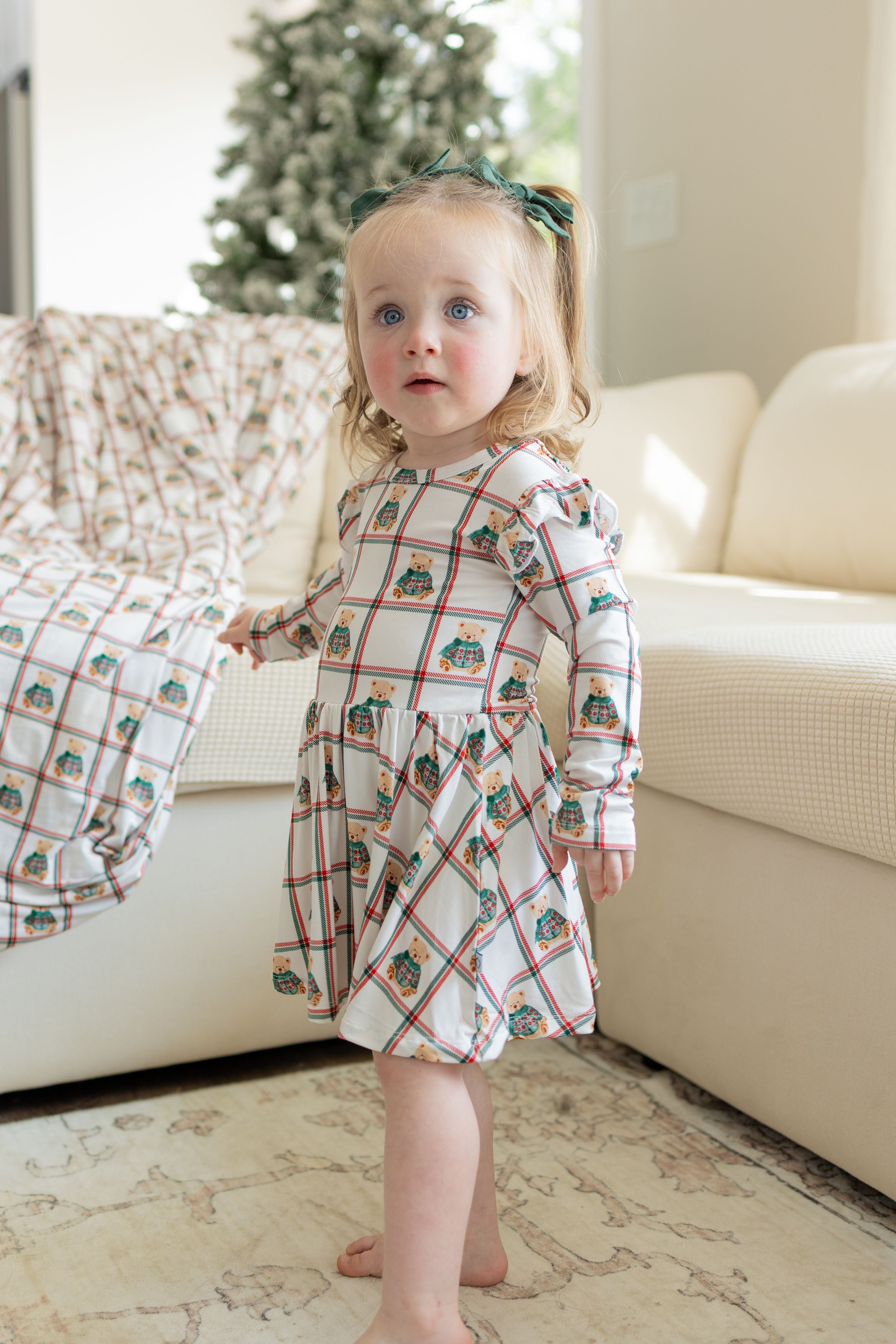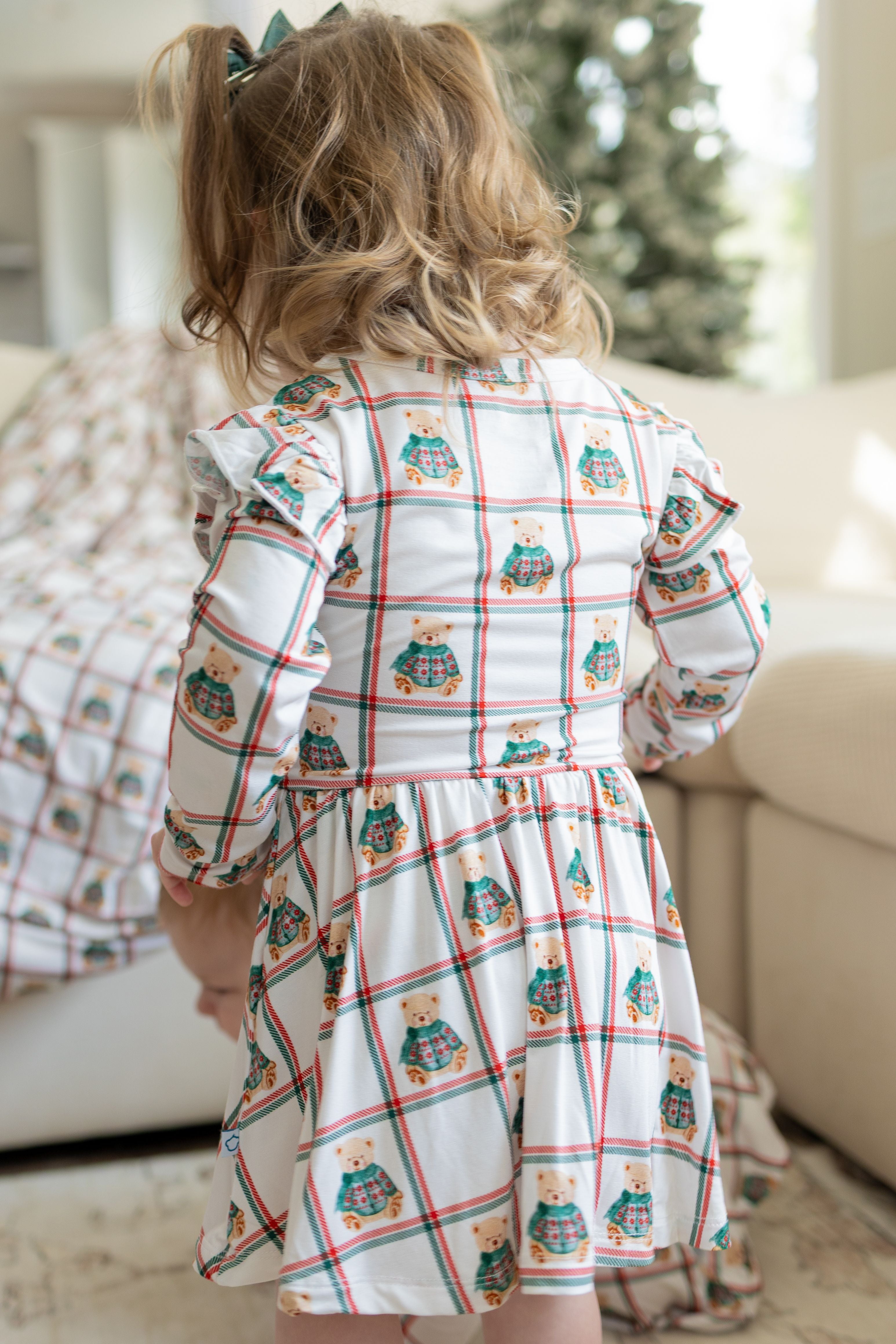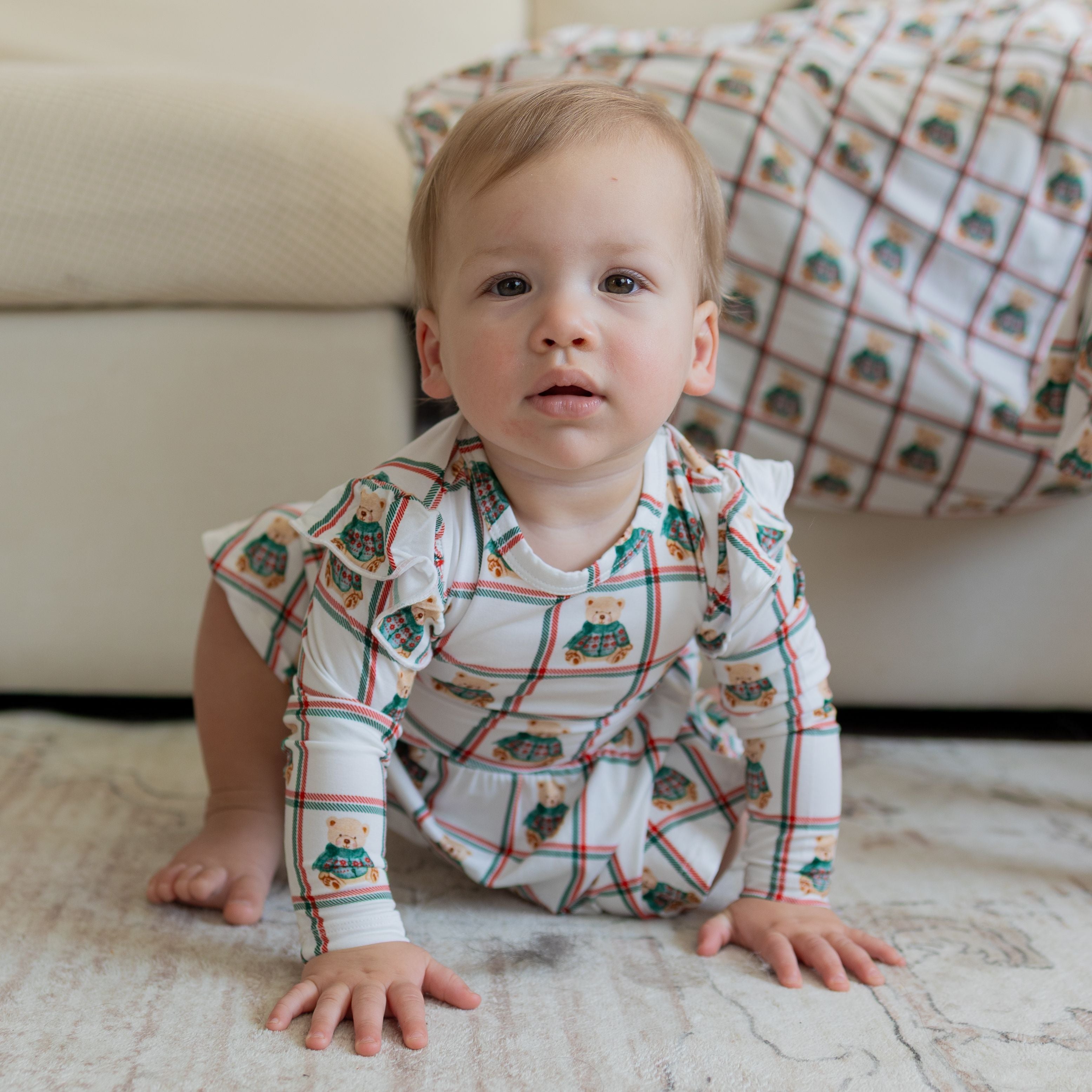 A holiday classic with a twirly twist! Our Vintage Teddy Bodysuit Twirl Dress features a festive plaid backdrop with the sweetest teddy bears in cozy green sweaters—perfect for all the season’s magical moments. With flutter cap long sleeves and an attached bodysuit with snaps for easy diaper changes, it’s both adorable and practical for little ones on the move. Made from buttery soft bamboo fabric that’s breathable, temperature-regulating, and gentle on sensitive skin.