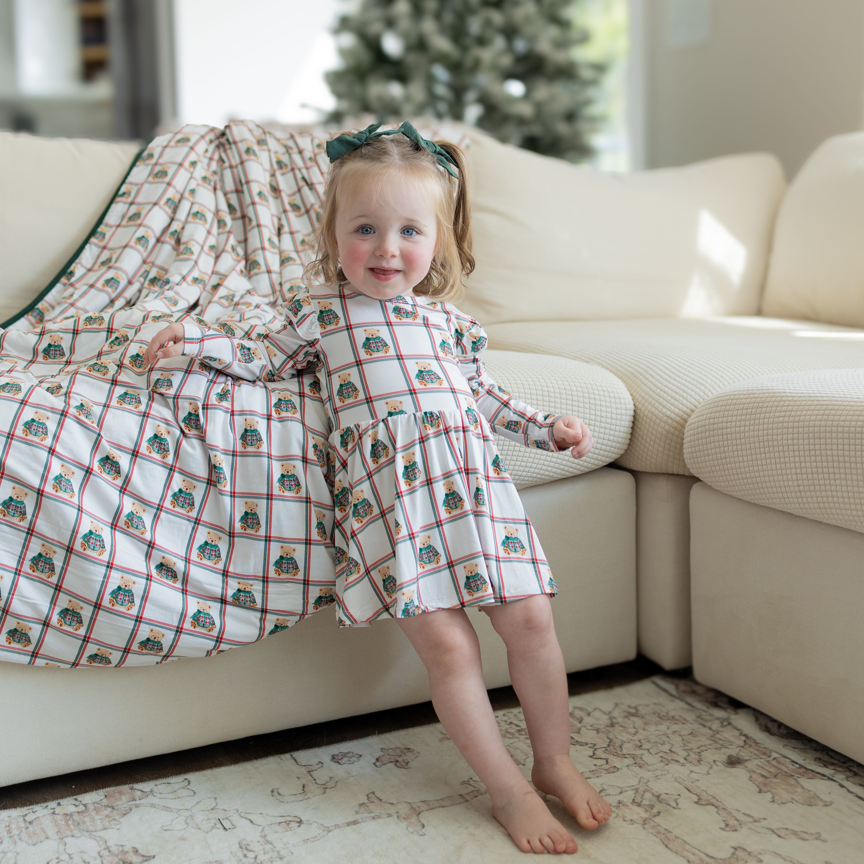 Wrap yourself in the warmth of nostalgia with our Vintage Teddy Bamboo Blanket. Featuring a vintage-inspired plaid print and the sweetest teddy bears in cozy green sweaters, this oversized blanket is perfect for holiday lounging, chilly nights, and all-season comfort. Crafted from our signature buttery soft bamboo lyocell blend, it's breathable, lightweight, and incredibly gentle on sensitive skin—bringing comfort and charm to every cozy corner.