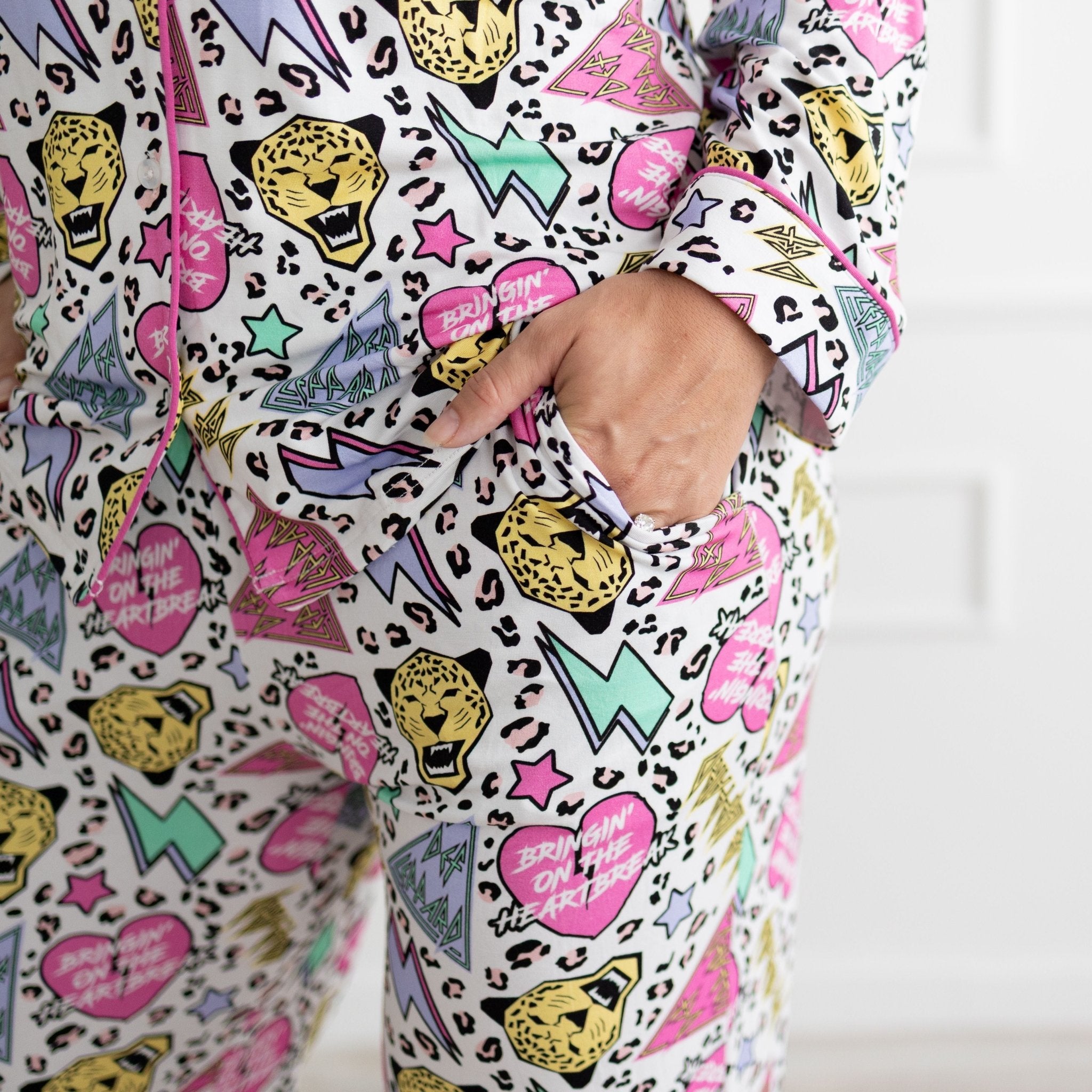 Bring a little rock ’n’ roll to your bedtime routine with our Sugar on Me Women’s Button Down PJ Set, designed in collaboration with the legendary Def Leppard. Featuring bold, colorful artwork inspired by one of the band’s most iconic hits, this set strikes the perfect balance between cozy comfort and rocker edge. Crafted from our buttery-soft bamboo lyocell blend, these PJs are breathable, stretchy, and silky smooth—keeping you comfy all night long (and stylish enough for lounging all day).