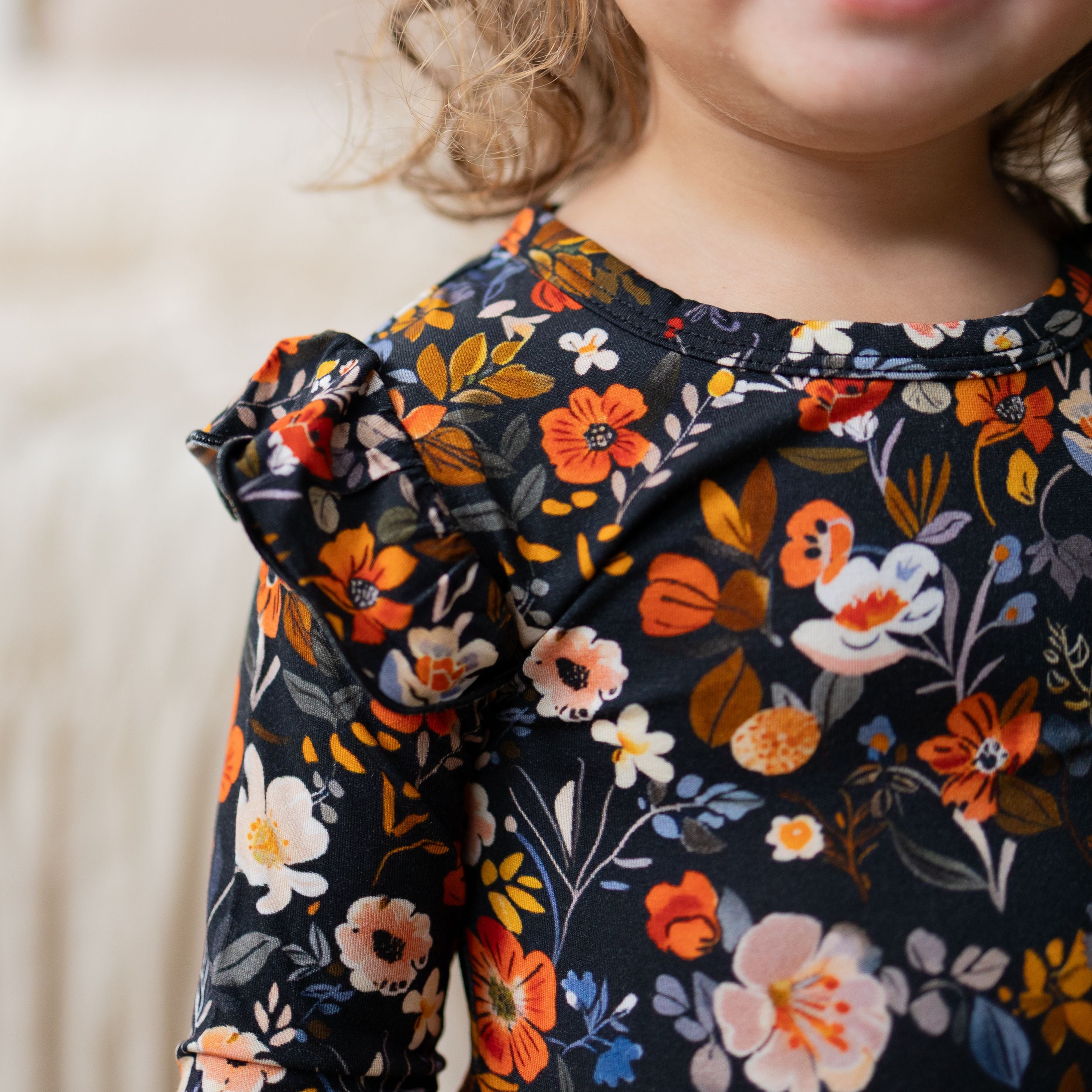 A fall favorite with a touch of sweetness — our Autumn Bloom Bodysuit Twirl Dress combines cozy comfort with everyday elegance. Made from our signature buttery-soft bamboo lyocell fabric, it features a deep navy backdrop covered in warm, autumn-hued florals and a soft peach trim for the perfect seasonal pop.